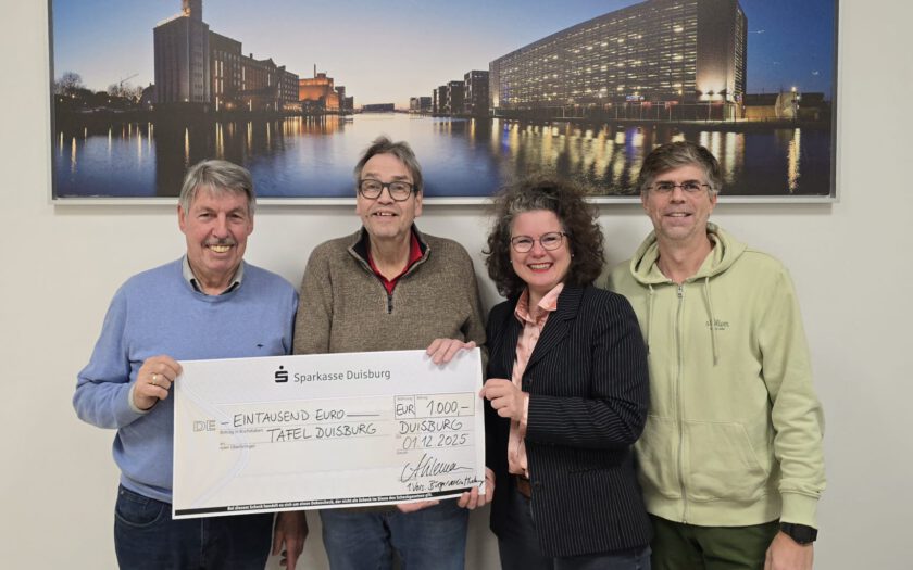 Auf dem Foto von links nach rechts: Harald Haarmann, 2. Vorsitzender BV Huckingen, Günter Spikofski, 1. Vorsitzender Tafel Duisburg, Alexandra Jockel, Beiratsmitglied BV Huckingen, Oliver Hölzken, Vorstandsmitglied/Kassierer BV Huckingen.