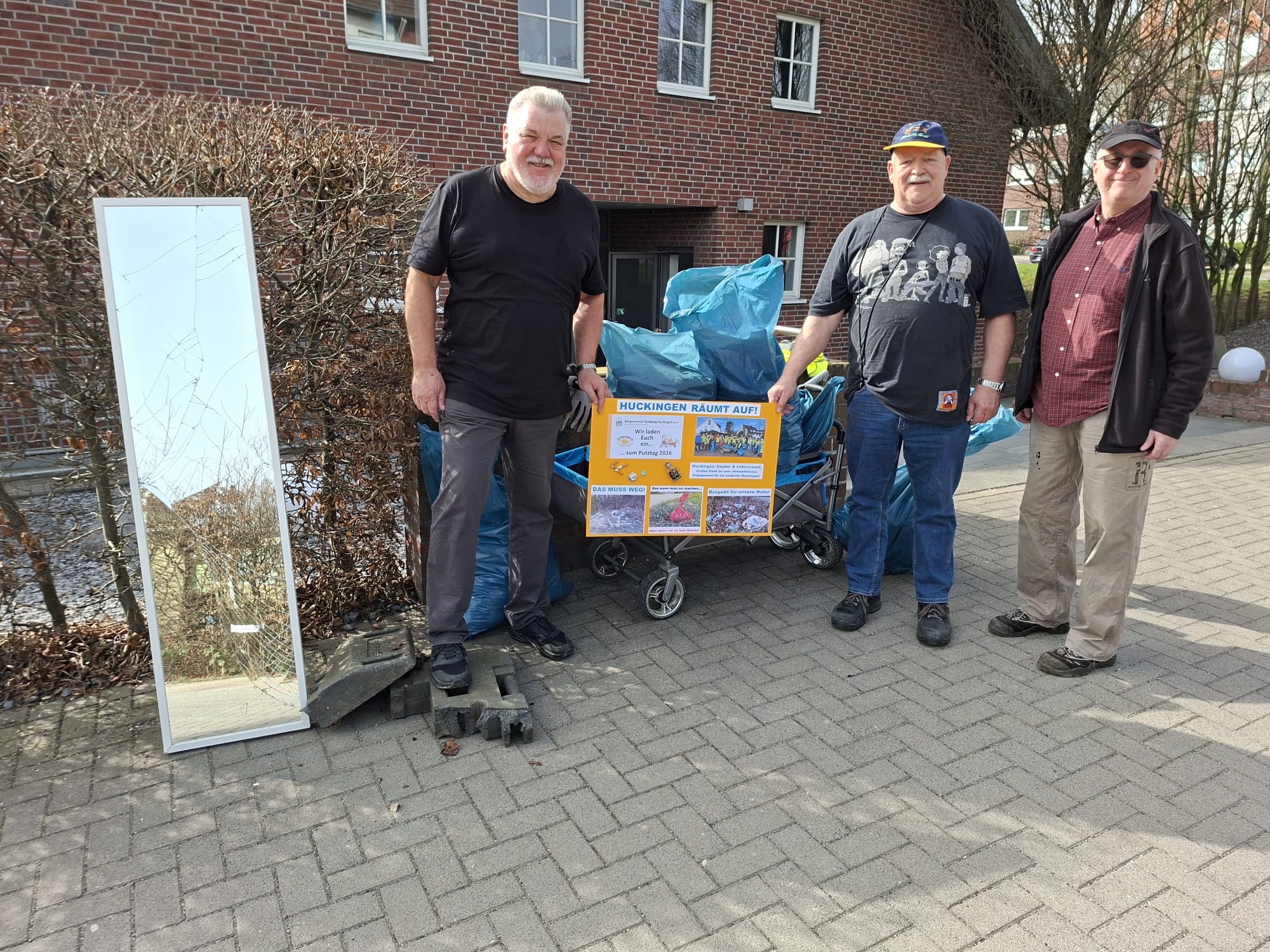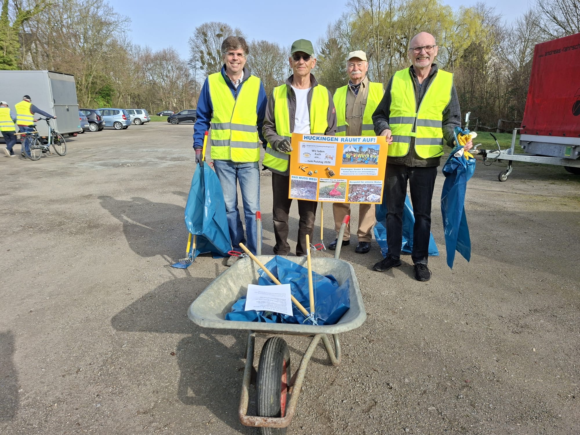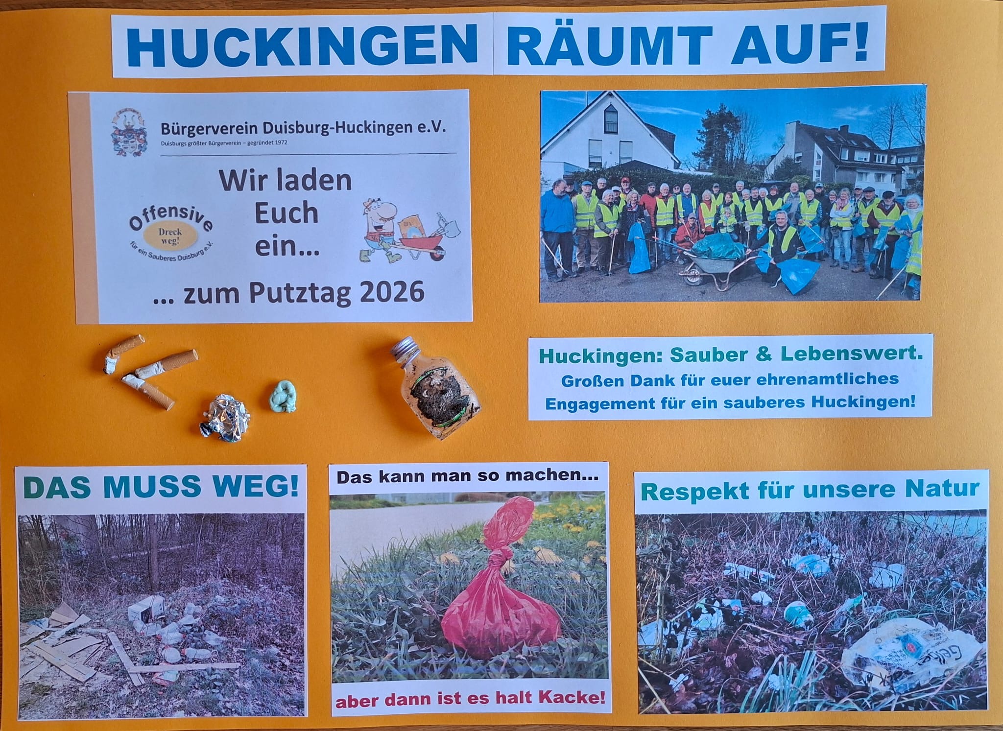 ANKÜNDIGUNG: Auch in 2026 werden wir Euch zum Putztag einladen! Wieder wird es notwendig sein, den absichtlich und auch achtlos weggeworfenen Abfall aus Grünanlagen und aus anderen Bereichen unseres Stadtteils zu entfernen. Der Huckinger Bürgerverein ruft seine Mitglieder auf zum „Saubermachen“ am Samstag, den 07. März 2026, 10:00 Uhr, Treffpunkt: Kirmesplatz an der Straße „Im Ährenfeld“.
